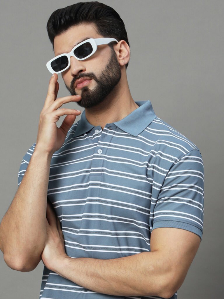 Men Striped Polo Neck Cotton Blend Blue T-Shirt